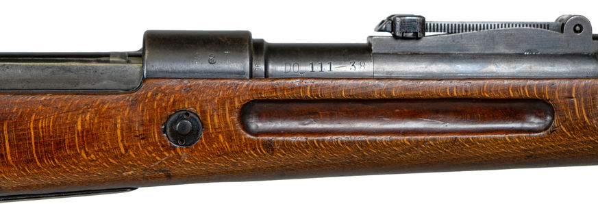 This specific K98 was a SS camp guard rifle that was taken at the infamous Dachau concentration camp by one of the first US Army medics sent into the camp after its liberation. This is shown by the Totenkopfs (also known as Death Heads) on the left hand side of the receiver and behind the underside of the trigger guard. During the Nazi era, Hitler's Schutzstaffel (SS) adopted one particular Totenkopf image as a symbol. Among other uses, it became the symbol of the SS-Totenkopfverbande (one of the original three branches of the SS, along with the Algemeine SS and the Waffen SS), whose purpose was to guard the concentration camps. The K98 has an effective range of 500 meters with iron sights and 1,000 meters with an 8x telescopic sight. Many of the Russian capture KAR98K rifles also feature a very distinct blued finish, which was done during the rebuild. This distinction can be seen on parts where the finish has a reddish hue.